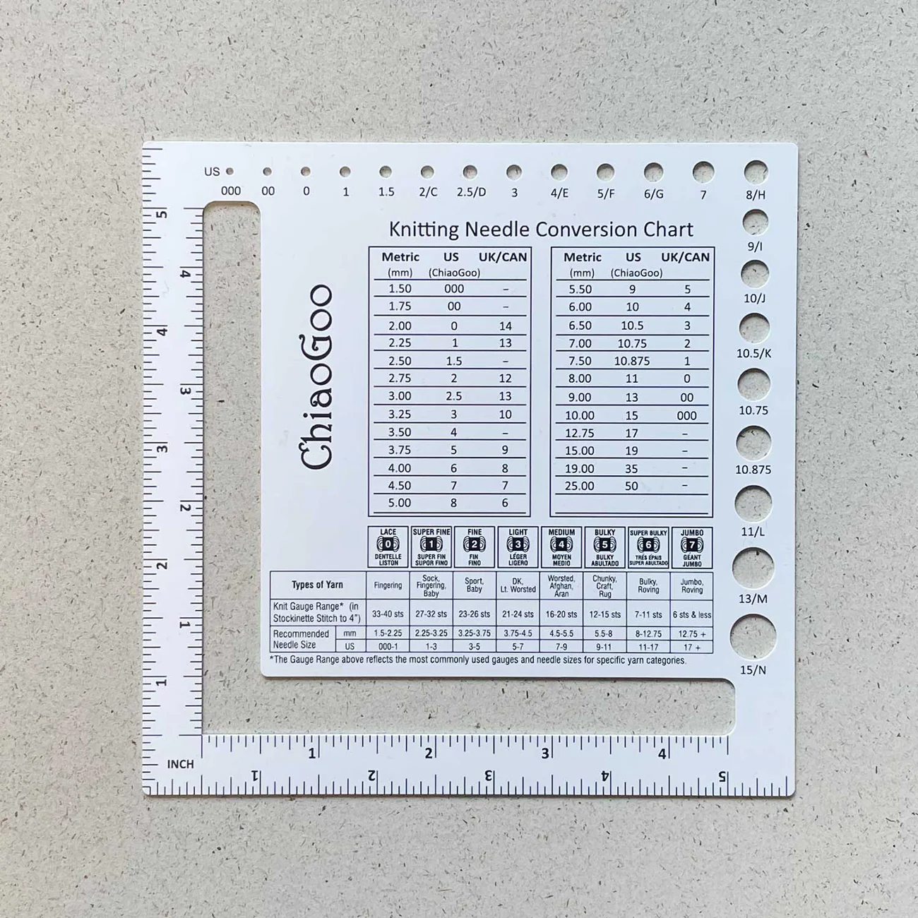 Deze handige gauge meter van ChiaoGoo van maar liefst 14 bij 14 cm heeft naast een handige naalddikte meter ook allerlei handige conversietabellen.
