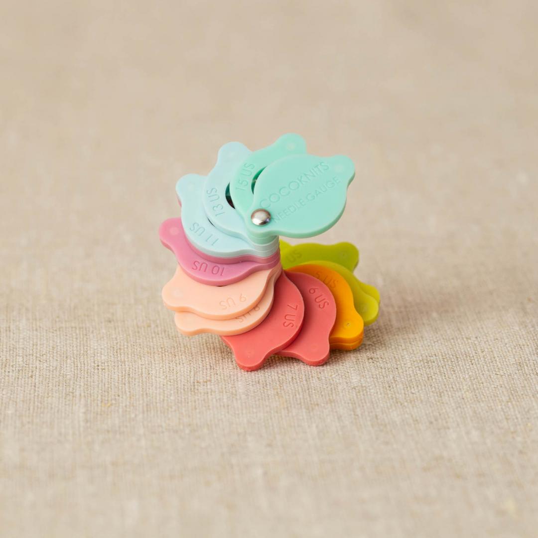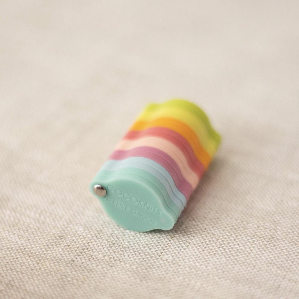Een vrolijke regenboogstapel van verbonden schijven voor het identificeren van breinaaldengroottes US 0-15 / 2-10 mm (deze zijn inbegrepen: 2,0 – 2,25 – 2,75 – 3,25 – 3,5 – 3,75 – 4 ,0 – 4,5 – 5,0 – 5,5 – 6,0 – 6,5 – 8,0 – 9,0 – 10,0).