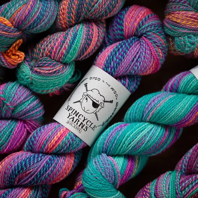 Dyed in the Wool is enorm veelzijdig en geschikt voor een brede stekenverhouding (ca. 20–34 steken per 10 cm, afhankelijk van naald en project). Op Ravelry en de website van Spincycle Yarns vind je talloze inspirerende ontwerpen die speciaal voor dit garen zijn ontwikkeld, zoals Alpine Bloom van Caitlin Hunter — een prachtig voorbeeld van hoe dit garen schittert in kleurwerk.