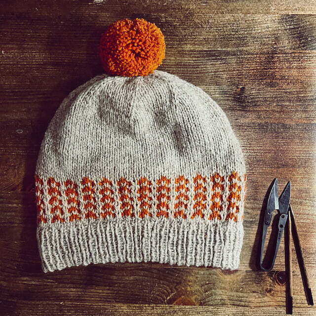 De muts wordt in de rondte gebreid vanaf de omgevouwen rand tot aan de bovenkant. Door slipsteken te maken, krijgt u een prachtig kleurwerk zonder dat u twee draden in één ronde hoeft te dragen, waardoor het de perfecte introductie tot kleurwerk is. Een optionele pompon wordt als laatste gehaakt.