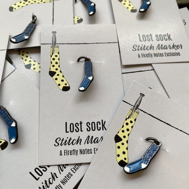 Deze stitch markers zijn exclusief ontworpen door Firefly Notes. De ring waarvan de sok hangt heeft een doorsnee van 10 mm. (rechter op de foto).