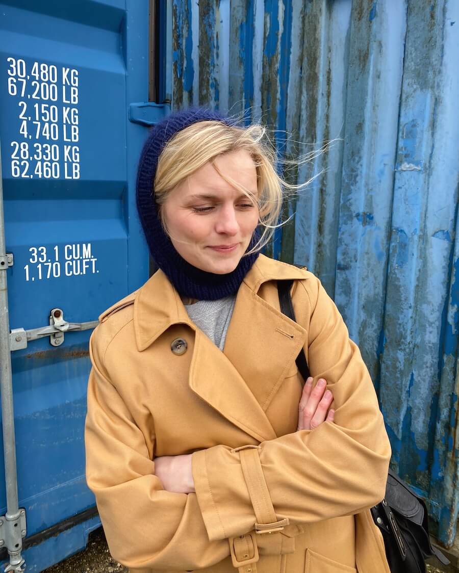 The balaclava has a feminine fit, as it covers the ears, but not the forehead or sides of the face. Note that the measurements given for the finished balaclava are for after it has been washed. The hat should be washed before wearing as the fisherman’s rib grows giving the hat the correct size.