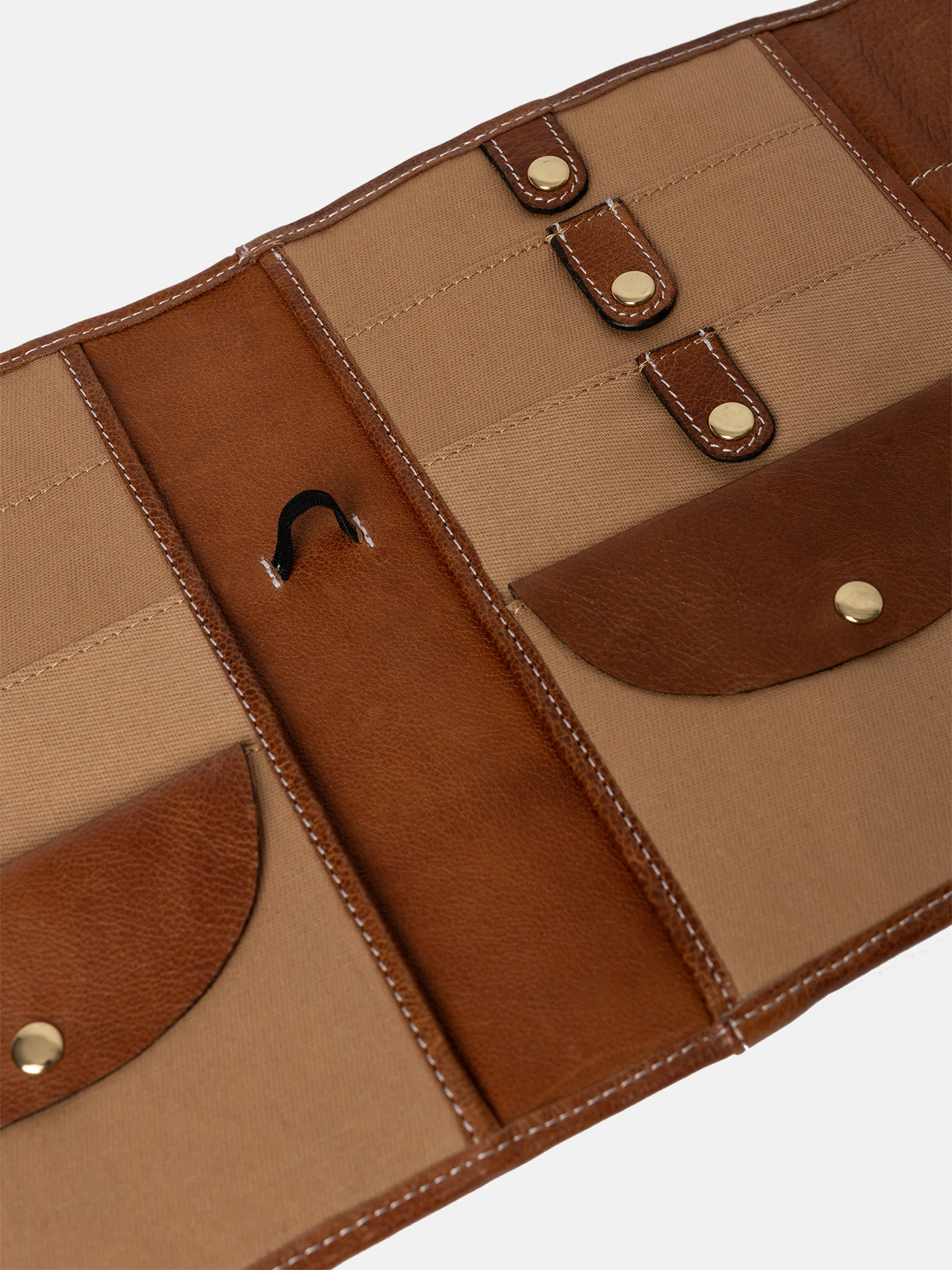 Het beschikt over 6 zakken met druksluitingen om kabels veilig op te bergen. Achter deze vakken bevinden zich open vakken waarin je breipatronen of soortgelijke spullen kunt opbergen. Dankzij de elastische band kun je je meetlint bij de hand houden, en er zijn 6 gaten in het leer voor 3 naalden. In totaal 18 smalle vakjes voor dpn’s, haaknaalden of rondbreinaalden, zodat ze overzichtelijk blijven.