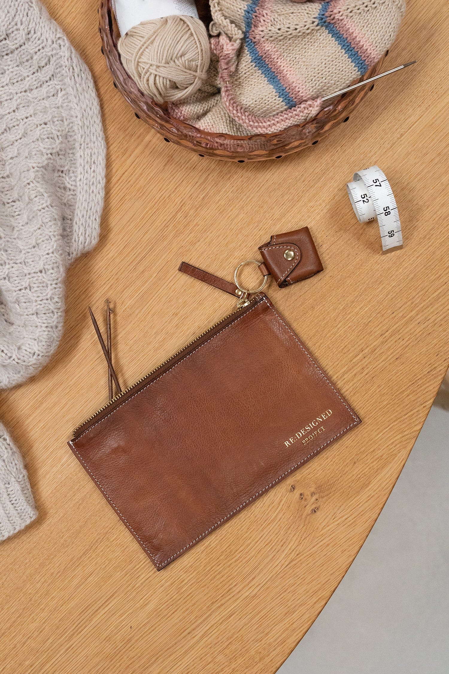 PROJECT 5 is een platte clutch van zacht leer met ruimte voor je breinaalden, scharen en andere breiaccessoires. Een ontwerp en gemaakt door het Deense Re-Designed.