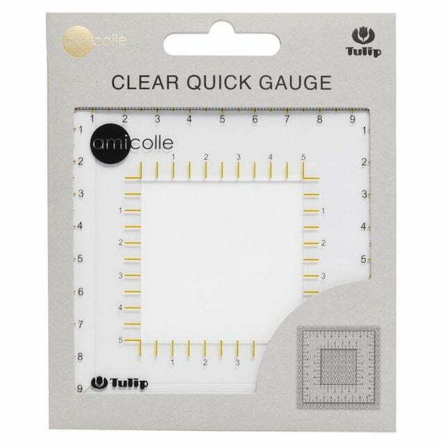 Een handig breimaatje van het Japanse merk Tulip. Geschikt voor het maken van een gauge. Het breimaatje is transparant van kleur. De binnenste maat is 5 bij 5 cm. De buitenste maat is 10 bij 10 cm. Door de geel gekleurde schaal is het ook goed te gebruiken voor donker breiwerk. Ook handig voor het tellen van steken.